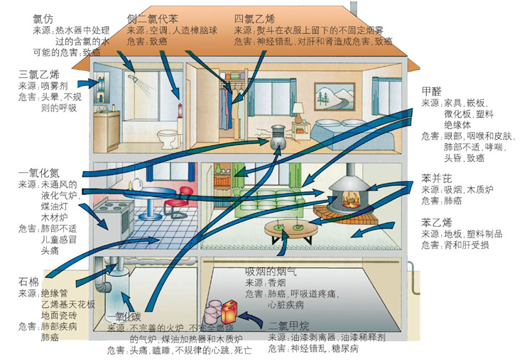 TVOC的主要來源:溶劑、油漆、染色劑、粘合劑、墻紙、地毯、合成纖維和清潔劑等;