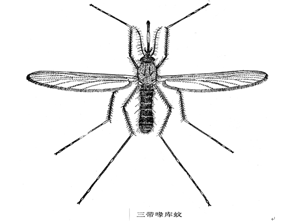 4、三帶喙庫蚊:翅無白斑,跗節(jié)有白環(huán),喙約中央處有白環(huán)