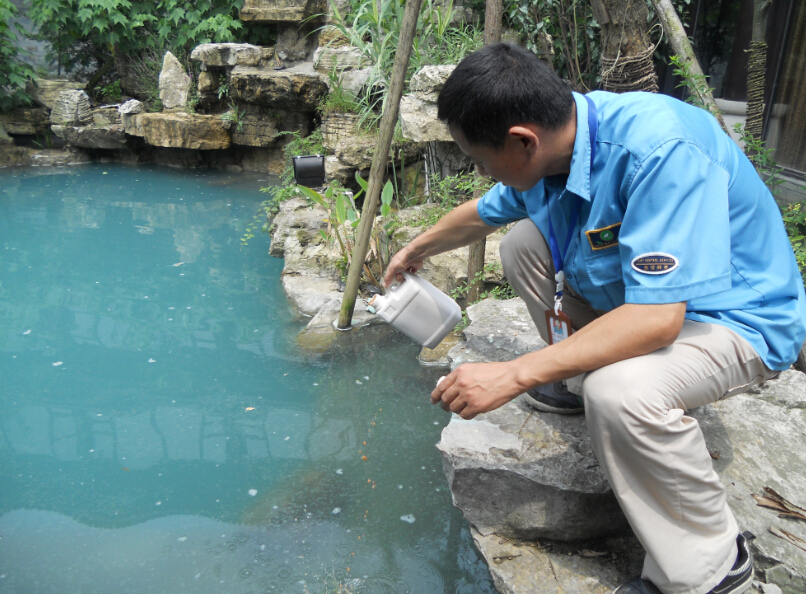 許多客戶單位內(nèi)都有大量的景觀水體,而景觀水體中又放有魚類等水生動(dòng)物,為此在對(duì)這一蚊蟲孳生地處理時(shí),我們需要選用等水生動(dòng)物無(wú)毒的生物殺蟲劑進(jìn)行蚊幼殺滅。